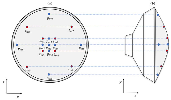 (a) Layout of an array of sensors for measuring pressure (denoted by ) and heating rate (denoted by ) on the heat shield of a Mars entry vehicle. (b) An alternative view of the sensor locations geometry looking in the direction of the positive x-axis.