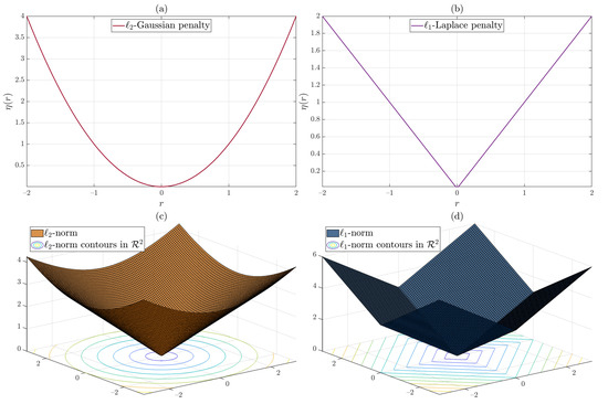 (a) -norm penalty corresponding to Gaussian observation noise. (b) -norm penalty corresponding to Laplace observation noise. (c) norm given by and its contours in . (d) -norm given by and its contours in .