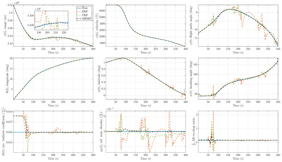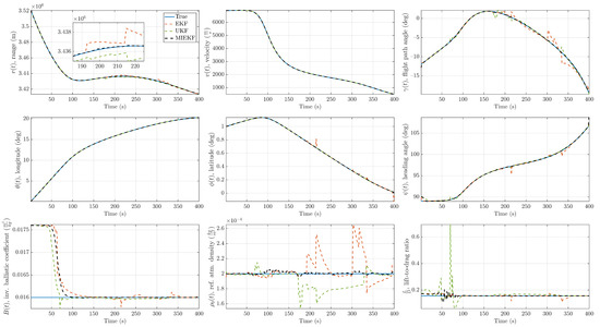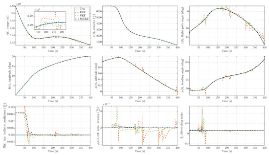 - Xiao, M.; Zhang, Y.; Wang, Z.; Fu, H. Augmented Robust Three-Stage Extended Kalman Filter for Mars Entry-Phase Autonomous Navigation. Int. J. Syst. Sci. 2018, 49, 27–42. [Google Scholar] [CrossRef]