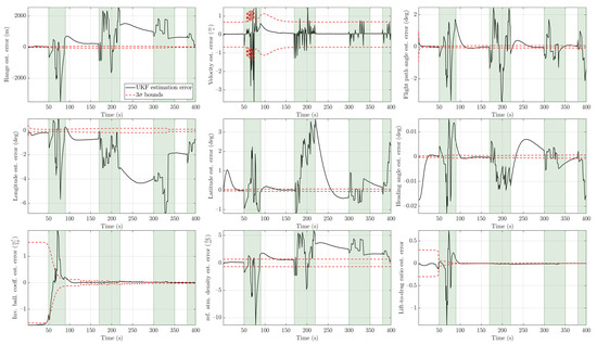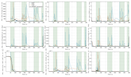 - Due to the utilization of additional sensors, the proposed scheme is, to our knowledge, the first to estimate the ballistic coefficient and reference atmospheric density independently and with high accuracy. Other related research works either estimate products of these parameters or require another projectile with a known ballistic coefficient to be launched from the entry vehicle to make the ballistic coefficient observable [21]. Other approaches involve trying to mitigate the effects of unobservable parameters on the state estimation using the considered Kalman filtering [26].