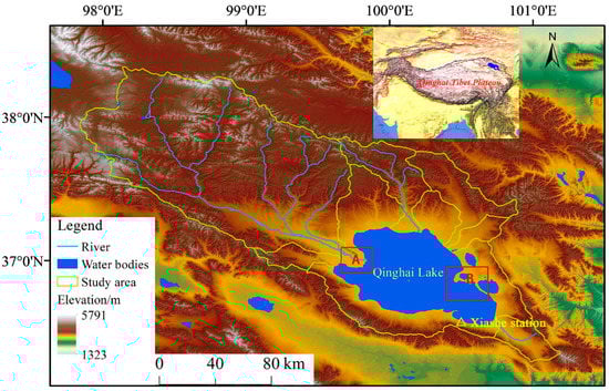 QHL, the largest inland salt-water lake in China, has a very important ecological position for natural shelter and climate regulation of Qinghai-Tibet Plateau. The QHL area is about 4300 km2 with a catchment of approximately 29,600 km2 (from 36°15′N to 38°20′N and 97°50′E to 101°20′E) (Figure 1). The cold and dry winter in the catchment is controlled by the Siberian High and the Mongolian High, while warm and wet summer is dominated by the East Asian monsoon. The annual total precipitation is about 350 mm from the historical records. The QHL is an essential water and wetland conservation area of western China, which is identified by the Ramsar Convention List of Wetlands of International Importance. In recent years, land degradation, soil salinization, and biodiversity loss took place and the surrounding wetlands were decreasing, which was caused by global climate change and unreasonable resource development and management. These phenomena indicate ecological deterioration trend of the lake basin gradually.
