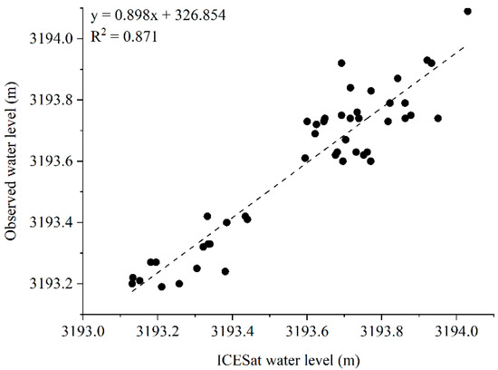In this study, observed water levels in the Xiashe hydrological station (36°35′16″N, 100°29′28″E) from 2003 to 2009 were used to verify the validity of ICESat datasets. As illustrated in Figure 3, the proximity between the observed and satellite water levels were characterized by RMSE = 0.099 m, R = 0.933, which indicated that ICESat/GLAS and ICESat-2/ATLAS datasets could accurately measure the water level in the QHL.