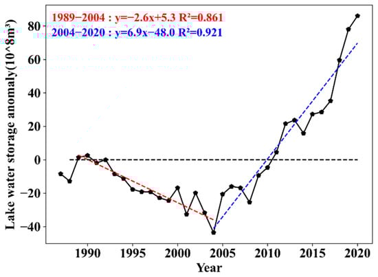The long-term time series of the QHL showed obvious phased characteristics in decades. Figure 4 presented the time series of lake storage anomalies from 1987 to 2020. It fluctuated with a slight expansion at the end of the 1980s, causing a 9.84 × 108 m3 storage increase from 1987 to 1989. However, a sharp decrease (−2.58 × 108 m3·yr−1, R2 = 0.86, p < 0.01) occurred from 1989 to 2004, which caused the minimum lake area to appear in 2004 during the past three decades. After 2004, there was a significant increase in lake storage in general with an average increasing rate of 6.92 × 108 m3·yr−1 (R2 = 0.92, p < 0.01). In general, the change of the QHL showed a pattern of “shrinkage–expansion” over the past three decades, which can be divided into two stages, namely, the decreasing stage (from 1987 to 2004) and the increasing stage (from 2004 to 2020), which both comprise 17 years. The turning point occurred in 2004 when the area of the QHL changed significantly, after which the area expanded gradually.