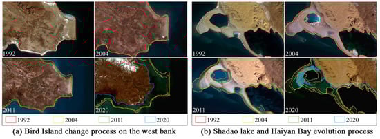 The phased characteristics of lake change were also reflected in the spatial scale. To investigate the shoreline change of the QHL, the thematic maps based on four Landsat images (1992, 2004, 2011 and 2020) were generated. Figure 5 clearly displayed that the west and east coast of the QHL changed distinctly during the past three decades, especially on Bird Island on the west coast (Figure 5a), and Shadao Island and Haiyan Bay on the east coast (Figure 5b). During the first stage from 1992 to 2004, the extent of water bodies decreased on Bird Island. In addition, decreases in water bodies were also identified in the eastern portions of the QHL. The area of Shadao Lake was significantly reduced, and the surface area of exposed sandy land continued to increase. The long sandbank between Haiyan Bay and the QHL was also significantly enlarged. By 2004, Shadao Lake and Haiyan Bay were almost entirely separated from the main body of the QHL. During the second stage from 2004 to 2011, as the area of the QHL gradually increased, the land shrank inwardly on Bird Island. It is noteworthy that the water bodies of Shadao Lake expanded the most, forming many smaller bodies of water in nearby sandy areas. After 2011, the water area of the QHL showed a significant trend of increasing expansion. Other than that, Shadao Lake and Haiyan Bay were connected to the main body of the QHL by 2020 when the sand bank was completely submerged by water. From a spatial perspective, the QHL has undergone a dynamic process of “slight shrinkage–expansion-rapid expansion” over 34 years.