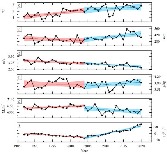 The variation of climate factors and lake area in Qinghai Basin during the period from 1987 to 2020. (a) average annual air temperature, (b) annual total precipitation, (c) average annual wind speed, (d) average annual specific humidity, (e) annual radiation, (f) lake storage anomaly. The pink area for 1987 to 2004, and the blue area for 2004 to 2020. The dashed lines are linear trends, respectively.