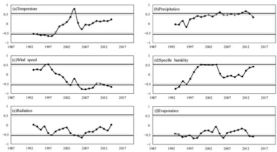 The 13-year sliding Correlation coefficients between lake storage anomaly and climatic factors ((a): Temperature; (b): Precipitation; (c): Wind speed; (d): Specific humidity; (e): Radiation; (f): Evaporation). The gray and black lines denote correlation required for significance at the 90% and 95% levels, respectively.