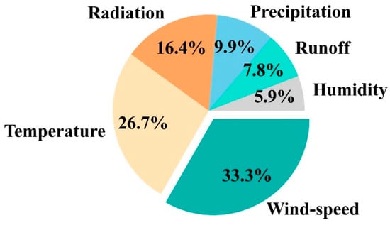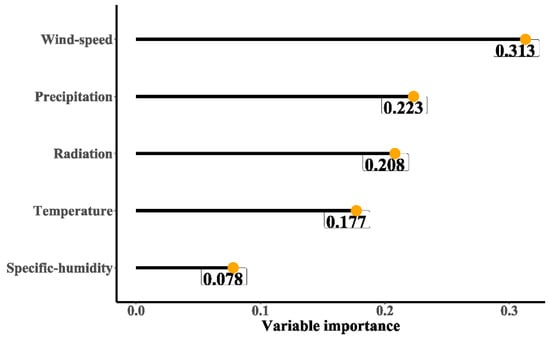 As mentioned in the literature review, RF can also effectively solve the problems of overfitting and multicollinearity, which have been widely used in data mining, ecology, and other disciplines [,,]. Indeed, RF regression can use the feature combination to include more than one predictor instead of using one predictor for one feature to reduce the high-order interactions. Thus, RF algorithms can assess the relative importance of predictive variables in a model for the global results and each class []. In the present research, the quantitative RF analysis showed that dominant factors were wind speed, precipitation, radiation, temperature, and specific humidity in order, explaining 31.3%, 22.3%, 20.8%, 17.7% and 7.8% of lake storage changes of the QHL, respectively. From the perspective of water balance, lake storage changes were decided by evaporation, precipitation, and runoff. Meanwhile, evaporation was mainly determined by wind speed, temperature, and radiation. In addition, river runoff was sensitive to precipitation []. Therefore, the lake storage changes were mainly influenced by evaporation and precipitation.
