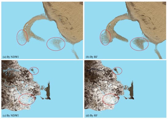 Lake Boundary extraction comparisons between NDWI (a,c) and RF (b,d).