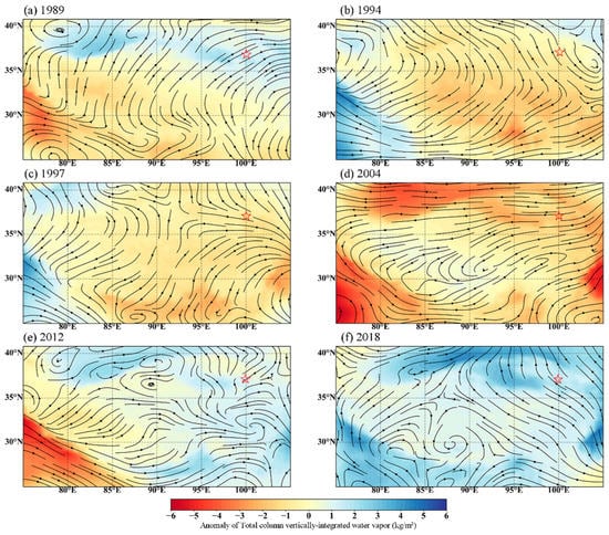 Anomaly distribution of vertically integrated summer water vapor in (a) 1989, (b) 1994, (c) 1997, (d) 2004, (e) 2012, and (f) 2018. The arrows represented water vapor transport. The red star showed the location of the QHL.