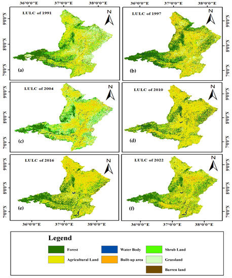 Land use/land cover (1991–2022): (a) LULC of 1991, (b) LULC of 1997, (c) LULC of 2004, (d) LULC of 2010, (e) LULC of 2016, and (f) LULC of 2022.