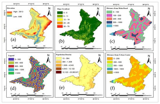 The spatial variables selected for the current study are altitude, slope gradient, distance from the main roads, distance from the streams, population density, and the distance from the urban centers based on previous studies [59]. After relevant spatial variables (Figure 5) were selected and factor maps were created, geometry matching was conducted, which included the cell size of the raster data, NoData value, data extent, dimension, and coordinate reference system. The cell size, NoData value, and coordinate reference system are 30 m, 0, and WGS_1984_UTM_Zone_37 N, respectively, for all spatial variables.