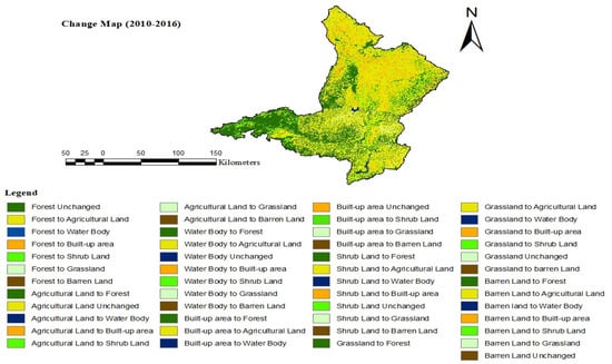 The QGIS MOLUSCE plugin provided artificial neural network (ANN) and cellular automata (CA) machine learning algorithms for LULC change simulation and prediction. ANN follows the nonparametric, nonlinear, and stochastic approach in LULC change simulation and prediction, which processes the potential to solve problems emanating from different variables [61]. Using its capacity to learn from a large number of datasets, ANN enabled the model to manage complex conditions during simulation. ANN basically uses the multilayer perception (MLP) approach [62] considering previously recorded LULC changes and spatial variables (explanatory variables) for LULC modification. In this study, the LULC of 1991, 1997, 2004, 2010, 2016, and 2022 (Table 8) and six spatial variables, including altitude, slope gradient, distance from the main road, distance from the streams, population density, and distance from the urban center, were considered as inputs for model simulation using the MOLUSCE plugin in QGIS. The initial and final rasters were the LULC maps of 2010 and 2016, respectively, to simulate 2022 LULC. The simulation model was constructed, and verification was performed for 2022. A change map was created using 2010 and 2016 LULC maps (Figure 6).