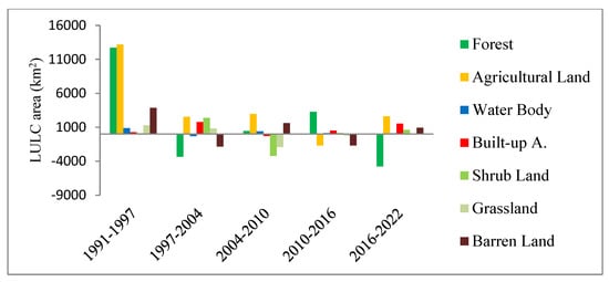 After the accuracy assessment was conducted and the classification status was evaluated based on the kappa value for each year, change detection for 1991–1997, 1997–2004, 2004–2010, 2010–2016, and 2016–2022 was performed using QGIS 3.22 software. Change detection, as shown in Figure 4, was presented using maps and bar graphs. From 1991 to 1997, forest and agricultural land showed a high increase in area, and built-up area and shrubland showed less change in area coverage (Table 5 and Table 6). Between 2016 and 2022, the forestland showed a dramatic change (decreased) in area, and the built-up area greatly increased (Table 6).