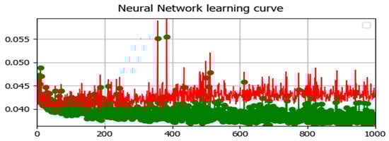 Based on MOLUSCE’s approach, transition potential modeling was conducted using an artificial neural network (ANN), which is ruled by the multilayer perception method employing neighborhood (1 px), learning rate (0.01) (Figure 8), maximum iteration (1000), hidden layer (12), momentum (0.05), fixed overall accuracy (−0.0018), minimum error for validation (0.0317), and validation kappa (0.9781). The model used 5000 randomly distributed samples to provide spatial representation for ANN. Based on the fixed value (0.01 learning rate), the neural network learned and simulated LULC changes for 2022.