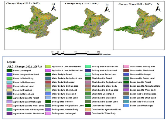 The evaluation performed on LULC changes during the course of the investigation showed significant changes across land LULC classes. The results from 2022 to 2067 demonstrate a discernible increase in built-up areas and a decrease in forest cover and shrubland. The area coverage and percentage changes for each LULC category are presented in Figure 11 and Table 11. Inter-transitions between LULC classes and their contribution to other classes intensify changes in LULC at times. As indicated in Table 11, between 2022 and 2037, agricultural land (2163 km2, 63%) and shrubland (1966 km2, 5%) showed a significant increase, and forest (−1649, −48%) and grassland (−107 km2, −0.31%) decreased. From 2037 to 2052, the built-up area of 1023 km2 (3%) showed a significant increase, and forest −267 km2 and agricultural land of −873 km2 (−3%) showed a significant decrease. From 2052 to 2067, the projected LULC simulation result showed that agricultural land (1079 km2, 3%) and built-up area (109 km2, 0.32%) increased and forest −544 km2 (−2%) and shrubland −191 km2 (−1%) showed significant decreases.