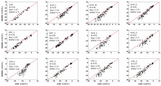 We evaluated the adaptability of the MODIS LST data using measured data from the PROMICE site. Since there are relatively few meteorological stations on the ice-sheet surface, we selected PROMICE 12 automatic meteorogical stations (AMS) to analyze the accuracy of the MODIS LST based on site locations and relative data volume. Meanwhile, three classical statistical indexes were used to estimate the performance of the MODIS product, including the bias, root-mean-square (RMSE), and correlation (R). It can be seen from Figure 2 that the MODIS LST agrees well with the AMS; with the R > 0.91, the EGP and KPC sites of AMS were 0.98 and 0.99, respectively. At the same time, we also obtained that the MODIS LST has a cold deviation of 2–4 °C, and the average RMSE was 4.12 °C, which was similar to the results obtained in previous studies. In short, the MODIS LST has a good applicability for assessing the surface temperature of the GrIS.