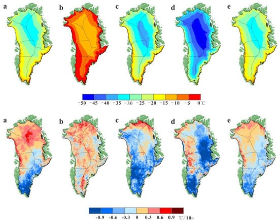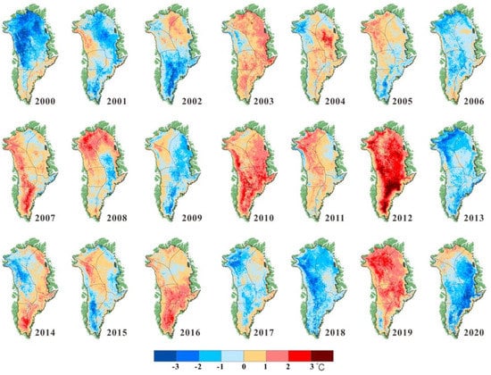 In this study, the mean annual and seasonal LST of the entire ice sheet and six basins were calculated [] (Spring: MAM, Summer: JJA, Autumn: SON, Winter: DJF). The temporal and spatial interannual variation of the GrIS LST was fitted by linear least-squares regression. Since the data started from March 2000, only 20 years of data were used to calculate seasonal and annual LST trends of each grid.