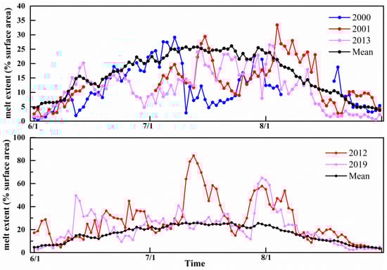 The summer surface temperature and melting extent of the GrIS have important effects on its mass balance; we have mapped the daily surface melting extent from 2000 to 2020, based on the MODIS daily LST (the ratio of the number of melt pixels multiplied by the total number of pixels over the GrIS. Percentage is calculated with respect to total number of pixels with LST observations for each date). In terms of daily melting, the summers of 2012 and 2019 experienced relatively intense melting with higher LST, while the cooler summers of 2000, 2001 and 2013 experienced less melting. As shown in Figure 5, 2012 was the most severe year for melting, with the maximum melting occurring between 12 July and 14 July. During these three days, an average of 74.9% of the ice sheet’s surface melted, compared with an average of 25.5% from 2000 to 2020. In 2019, the most severe melting occurred between 30 July and 2 August, the first time since 11 July 2012 that melting was detected at the highest point of the GrIS (Summit Station) []. For years with less melting, all dates showed less than the 2000–2020 average except for 4–14 August 2001. At the same time, the melting was stronger in July than in June and August, which was also due to the higher LST in July.