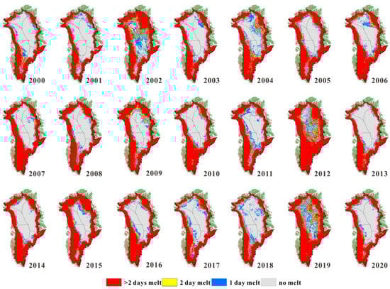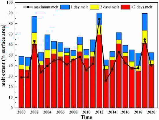 Cumulative melting, the maximum and short period of the melting extent, are shown in Figure 6 during 2000–2020 summer. Map of annual melting extent derived from MODIS LST record are shown in Figure 6. As shown in the figure, the cumulative melting extent of the GrIS experienced over 80% melting in the summer of 2002, 2012 and 2019, with 86.9%, 89.9% and 89.7%, of the area experiencing melting, respectively. From Figure 7, however, compared with 2012, the area of short period of melting in 2002 and 2019 is larger, accounting for 30.6% and 31.4%, of the cumulative melting extent respectively. In 2012, it is only 22.9%. The fact that a short period of melting was more common in 2002 and 2019 (especially one-day melts) than in 2012, and that the maximum melt extent in 2012 was much higher than in 2002 and 2019, suggests that the surface melting of the GrIS in the summer of 2012 was more sustained and severe than in 2002 and 2019. The unusual warmth and extreme melting in July 2012 was caused by a combination of reduced albedo and high Greenland blocking [,,]; the atmospheric conditions of the anticyclone south of the ice sheet caused advection in a relatively warm southwest stream, to the western side of the GrIS, resulting in a warmer and drier ice sheet.