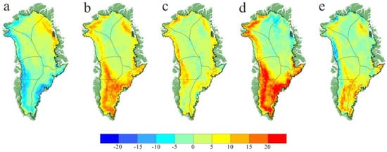The Moderate Resolution Imaging Spectroradiometer (MODIS) is a polar-orbiting, 36-channel, and across-track scanning spectro-radiometer whose images cover the whole region of the planet every one to two days. MODIS is on board the Terra and Aqua satellites of the NASA Earth Observation System (EOS), with data dating back to 2000 and 2002, respectively. The 1-d L3 Global Land Surface Temperature and Emissivity product (MOD11A1, discussed in detail in Wan []) Version 6, considered a proxy for the intensity of summer melting, was used to monitor the spatial and temporal evolution of mean LST on the GrIS. The MODIS Reprojection Tool was used for data Mosaic and projection transformation. According to the processing method of Qie et al. [], 2 K was set as the threshold, and data with an error less than 2 K was used as the data for analysis. Pixels with an error greater than 2 K were removed. Meanwhile, as the ice surface temperature is less than or equal to 0 °C, a few spurious pixels (>0 °C) were calculated as 0 °C when calculating the mean LST [].
