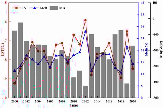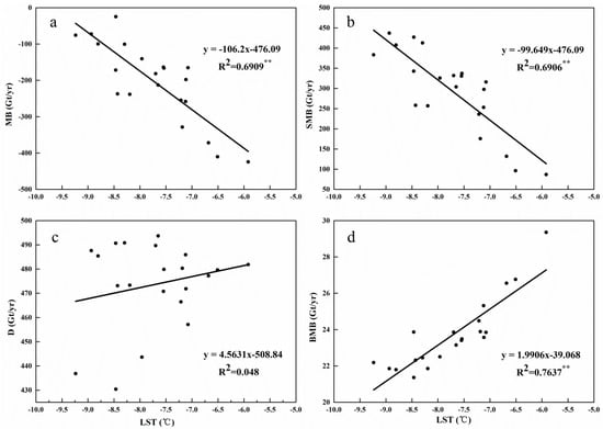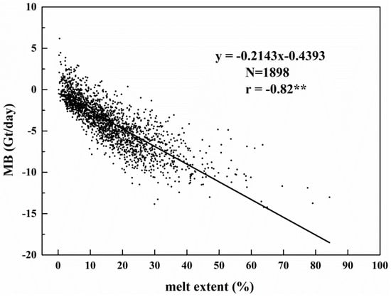 Although there are many factors affecting the mass balance of the Greenland ice sheet, such as air temperature, precipitation, topographic conditions and surface moraines, climate factors (temperature and precipitation) are the key factors affecting the mass balance. The time series of mean LST, melting extent and MB of the GrIS from 2000 to 2020 are shown in Figure 9. The results show that the LST has a good consistency with the melting extent, but both of them show a roughly opposite trend to the MB, that is, the higher the LST, the greater the melting extent, and the greater the mass loss. Based on the summer LST from 2000 to 2020, the impact of surface-temperature changes on the mass balance of the GrIS is evaluated, as shown in Figure 10. The surface temperature of the GrIS is significantly correlated with MB, SMB and BMB, but has no relative significant correlation with D. This may be because the influence of surface temperature on the SMB and BMB is relatively rapid, while D is affected by sea-surface temperature. Meanwhile, the linear fit results show that a 1 °C increased in the GrIS surface temperature equates to a 106.2 Gt/yr decrease in MB, which for this temperature change consists of a 99.65 Gt/yr decrease in SMB, and a 1.99 Gt/yr increase in BMB. It can be concluded that 93.83% (6.17%) of the ice sheet’s response to changing surface temperature has been via SMB (D and BMB), excluding other conditions such as precipitation changes. We also made a comparison of the ablation range and MB, and Figure 11 showed that the ablation range calculated based on LST was also a good indicator of MB change. When the surface of the ice sheet melts, mass loss is initiated within a few days thereafter. When a relatively large surface melting occurs, it is usually accompanied by a large mass loss.