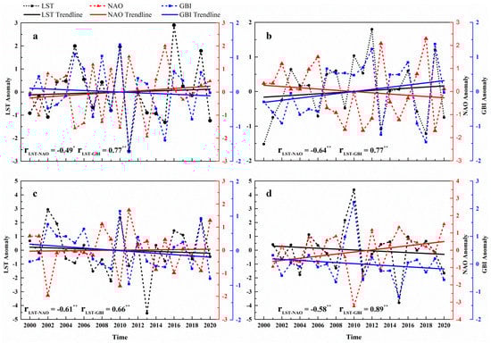 The GrIS LST, NAO and GBI anomaly time series, (a) MAM; (b) JJA; (c) SON; (d) DJF; * and ** Indicates a confidence level of 0.05 and 0.01.