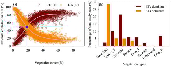 Contribution rate (%) of ETC and ETS to ET from 2000 to 2020. (a) Contribution rate of ETC and ETS to ET along the vegetation cover gradient. (b) Percentage of area where ETC and ETS dominate ET variation in the total study area under different vegetation types. In panel (b), the crop I and crop R represent the irrigated and rain-fed croplands, respectively, and sparse V indicates sparse vegetation.
