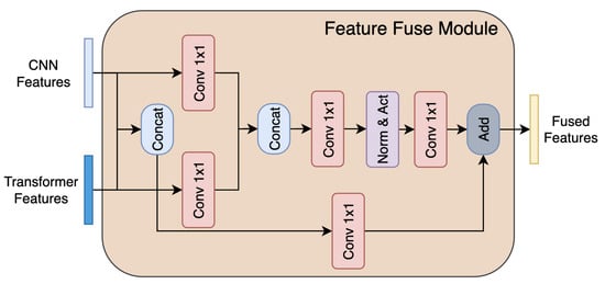 The multi-scale feature-fusion module was designed to aggregate the local features from the CNN branch and the global features from the transformer branch. It efficiently and flexibly fused the features with different resolutions and channel numbers, and its structure is shown in Figure 2.