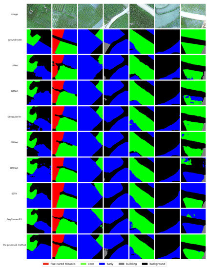 Combining both advantages of a CNN and a transformer, the proposed CTFuseNet achieved the highest segmentation of 85.33% for mIoU and 92.46% for PA. Moreover, as shown in Figure 6, the CNN-based networks resulted in biases, especially at the edge of large ranges of crops in complex scenes (column 2 in Figure 6) while the transformer-based networks were not accurate for the segmentation of small ranges of crops (column 6 in Figure 6), and erroneous segmentation occurred in areas where crops were sparsely grown (column 7 in Figure 6). The proposed CTFuseNet obtained the best segmentation results.