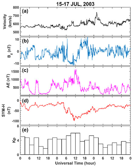 Geophysical conditions during the period 15–17 July 2003: (a) solar wind velocity, (b) IMF Bz, (c) AE index, (d) SYM-H index, and (e) Kp index. IMF = interplanetary magnetic field.