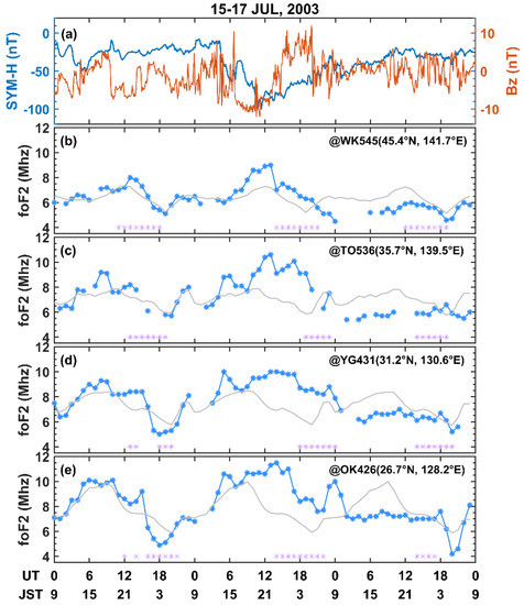 Figure 3 displays the SYM-H and IMF Bz indices, and the variation in foF2 observed by a meridional chain of four ionosondes along the longitude of ~135°E with decreasing latitude during the period 15–17 July 2003. The blue lines with stars represent the foF2 parameter. For comparison, the gray lines indicate the 27 day moving average value of foF2. On 16 July, Figure 3a shows the geomagnetic storm development during the period 15–17 July 2003. Figure 3c–e show that the first obvious increase peak of foF2 appeared at 5 UT on 16 July 2003, when the IMF Bz rapidly turned southward. The southward IMF Bz usually produced the eastward PPEF in the equatorial daytime ionosphere. It is likely that the enhanced eastward electric field causes an equatorial fountain effect, transporting plasma from the equatorial region to higher altitudes and latitudes [44]. However, at the higher latitude WK545 station, no enhancement of foF2 was observed at the same moment as shown in Figure 3b, suggesting that the range of latitudes affected by this PPEF was limited. After that, Figure 3b–e show that foF2 started to increase at ~7–9 UT with a large amplitude compared with that on the reference day, showing a positive storm effect. It seems that the foF2 started to increase first at the lower latitude station, especially in Figure 3c–e. The enhancements of foF2 lasted for more than 10 h from the main phase to the recovery phase of this storm. Then, the decrease in foF2 occurred at ~1 UT on 17 July, and this negative storm effect lasted for almost the entire day. Figure 4b–e also present the existence of spread F marked as light purple stars, as recorded by ionograms with 1 h intervals. Here, we did not distinguish the types of spread F. To our surprise, spread F signatures were observed at all four ionosondes every night during the period 15–17 July 2003. After storm onset, Figure 3b–e show that the durations of spread F at WK545, TO536, YG431, and OK426 were 14–21 UT (23-06 JST), 19–23 UT (04-07 JST), 18–24 UT (03-08 JST), and 14–22 UT (23-06 JST) on 16 July, respectively. Spread F at WK545 and OK426 occurred slightly earlier than midnight, while spread F at TO536 and YG431 occurred after midnight. The above spread F tended to occur at 18–24 UT (03-08 JST), which is persisted until the next morning. On 15 and 17 July, spread F tended to mainly occur at 12–18 UT (21-03 JST) and remained continuous, except for the occurrence at YG431 and OK426 where the duration of spread F was not completely continuous on 15 July. Although few spread F lasted into the morning, such as at OK426 on 15 July, they disappeared no later than 06 JST, and slightly earlier than that on 16 July.