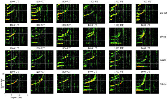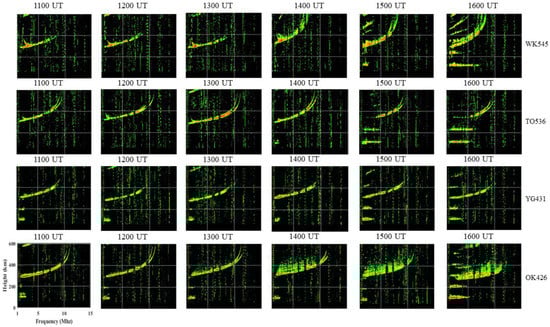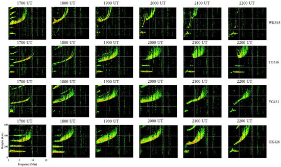 To facilitate the study of the evolution and occurrence characteristics of spread F, we further present ionograms with 1 h intervals. Usually, spread F is identified as four types: frequency spread F (FSF), range spread F (RSF), mixed spread F (MSF), and strong range spread F (SSF) [45,46,47]. FSF in the ionograms appears as the intensity of scattered echo traces increased with frequency, accompanied by the failure to identify foF2. RSF is scattered echo traces at lower frequency with clear foF2. MSF is a mixture of FSF and RSF. SSF is described as an extended range spread on F region echoes traces that significantly extend beyond the local foF2 value [45]. Combined with the statistical results in Figure 3, Figure 4 first illustrates the evolution of spread F at four ionosondes during the period 17–22 UT (02-07 JST) on 16 July 2003. At first glance, the occurrences of spread F were indeed quite high during this period of interest. Especially at the three lower latitude stations of TO536, YG431, and OK426, we notice that the scattered echo traces are mainly SSF, as shown in Figure 4. It seems that the lower the latitude of the station is, the earlier the time of SSF appears. On the top panel (WK545) in Figure 4, the SSF that occurred at 17–19 UT (02-04 JST) is not as strong as spread F at the three lower latitude stations. At 20–21 UT, the types of spread F changed to weak FSF. The different morphology of spread F traces suggested that the generation mechanism of spread F at WK545 may be different from that at other stations. In addition, Figure 4 also presents the high-frequency occurrence of sporadic E (Es) with a relatively small magnitude at altitudes of ~100 km. Intriguingly, the so-called cusp type Es, which is connected to the thick E layer trace [29], developed well in the ionospheric E region after 21 UT (06 JST) during the local morning.