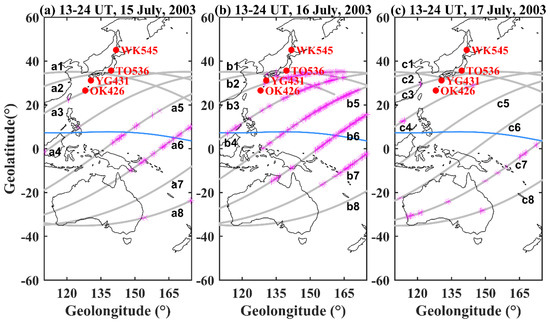 ROCSAT-1 ascending tracks marked with different labels over the Eastern Asian sector during 13–24 UT on (a) 15, (b) 16, and (c) 17 July 2003. The purple stars along the ROCSAT-1 orbits represent each of the identified density irregularity structures (the criterion of σ ≥ 0.3%) obtained from the method proposed by Su et al. [1]. The red dots represent the geographic location of the four ionosondes (WK545, TO536, YG431, and OK426 used in this study). The blue lines indicate the geomagnetic equator.