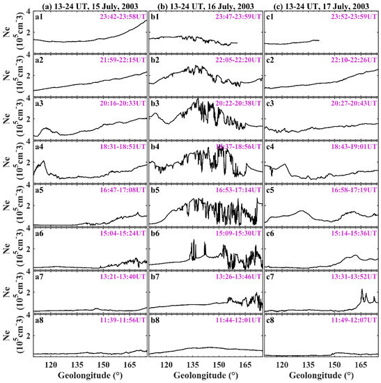 In order to more directly identify plasma density depletion, Figure 8 further shows the variation in in situ ion density measured by ROCSAT-1 as a function of geographic longitude with its tracks corresponding to the marks in Figure 7. The UT time is drawn in the upper right corner of each subfigure. Figure 8 shows that compared with the plasma density on 15 and 17 July, the overall plasma density on 16 July was obviously enhanced, consistent with the enhancements of foF2 observed during the magnetic storm in Figure 3. In addition, Figure 8a,c show relatively stable changes in plasma density. However, Figure 8b shows that ROCSAT-1 encountered clear plasma density depletion on tracks b1–b7, proving the reliability of the density irregularity structure identified in Figure 7b. It should be noted that this plasma depletion mainly occurred in the midnight-morning sector. No signatures of plasma depletion were measured on track b8, which may be due to the time required for EPBs to grow from the magnetic equator to southern midlatitudes. We note in Figure 8b that the eastern edge of plasma density depletion moved westward as time passed, especially from tracks b5 to b1. We checked the westward drift motion of plasma depletion on the zonal drift parameters recorded by ROCAST-1. After 22 UT, only small magnitudes of plasma density depletions were detected around the latitude of Japan on tracks b1 and b2. This is because after dawn, the photoionization process can produce new plasma particles to fill plasma depletion at high altitudes. As shown in Figure 8b, other ionospheric irregularity structures, i.e., plasma blobs, appear in the form of plasma density enhancement around the longitude of ~135°/~160° on tracks b6/b7, respectively. These plasma blobs on both tracks also identified at similar latitudes in the Southern Hemisphere as suggested in Figure 7, indicating a possible linkage of the extension of EPBs [51,52]. Figure 8a shows a series of weak plasma depletions on tracks a5 and a6, corresponding to the density irregularity structure recorded near the magnetic equator in Figure 7a. We inferred that these weak plasma depletions were the remnant of the EPBs initiated during sunset hours. Some of plasma density enhancements shown in Figure 8c were also identified as ionospheric irregularity structures in Figure 7c. The detailed generation mechanism of plasma density enhancement is beyond the scope of this study.