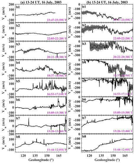 To study the behavior and evolution of plasma depletion, Figure 9 shows the variation in the 5-s averaged plasma vertical and zonal drifts for the corresponding ROCSAT-1 tracks as shown in Figure 8b. The UT time is drawn in the bottom right corner of each subfigure. Many wave-like variations exist in plasma drift especially in zonal drift on some tracks, such as b1–b4, which is due to the influence of solar photons on RPA after sunrise [53]. In addition, some outliers were also occasionally recorded by ROCSAT-1. Therefore, we need to try our best to recognize the feature of drift inside plasma depletion and reveal some disturbance effects caused by magnetic storm. Figure 9a shows that the vertical drifts inside plasma depletions were upward with the magnitude of over 100 m/s on tracks b5–b7 in the postmidnight sector. This upward drift indicated the continuous growth and extension of plasma depletion, suggesting that plasma depletion is still alive during that postmidnight period. Another important feature in Figure 9a is that the vertical drift has a weak upward velocity in the ambient ionosphere on most tracks, as opposed to the downward plasma velocity during quiet-time periods. The upward drift moves plasma from a lower altitude to a higher altitude, causing an uplift of the ionospheric F region [51,53,54]. Since plasma resides at higher altitudes where the recombination rate is low, the enhancements in foF2 and in situ ion density were observed by ionosondes and ROCSAT-1, respectively. Importantly, owing to the lower recombination rate at high altitudes, the strong uplift of the ionosphere is more conducive to EPBs generation due to the high RT instability growth rate. Moreover, such ionospheric conditions also become more favorable to the existence of long-lasting plasma bubbles because it should take a long time for the photoionization process to produce enough new plasma particles to refill the low-density region at high altitudes [51,54]. During the quiet-time period, the nighttime zonal drifts were eastward, and reversed its direction westward at ~05 LT as measured by the C/NOFS satellite [55]. However, the ambient zonal drifts were westward in the midnight-morning sector observed during this storm as shown in Figure 9b. In particular, zonal drifts inside plasma depletion on tracks b5 and b6 were strongly westward. The above results suggested that plasma drifts in the ambient ionosphere were strongly affected by the magnetic storm.