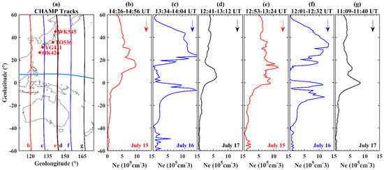 (a) CHAMP descending tracks marked with the corresponding right subgraph labels over the Eastern Asian sector during 11–15 UT on 15 (red), 16 (blue), and 17 (black) July 2003. The red dots represent the geographic location of the four ionosondes (WK545, TO536, YG431, and OK426 used in this study). The blue lines indicate the geomagnetic equator. The corresponding in situ electron density (Ne) variations as a function of geographic latitude are shown in right panels (b–g), respectively. The arrows indicate the descending orbits.
