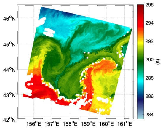 - The Sentinel-3 non-time-critical (NTC) observations distributed as L2P SST products by EUMETSAT. These products follow the Group for High Resolution Sea Surface Temperature data format specification (GHRSST, https://www.ghrsst.org/, accessed on 28 November 2022), which means they include both single-channel top-of-the-atmosphere brightness temperatures (L1) and skin SST (L2) data in the same file, together with specific L2P and user-defined SST quality flags. The quality flag is an indicator of the SST accuracy and ranges from 0 to 5: (i) 0 = missing data; (ii) 1 = cloud; (iii) 2 = worst quality, (iv) 3 = low quality; (v) 4 = acceptable quality; (vi) 5 = best quality. The L2P SST and related flags are actually those computed from dual-view data, but nadir-view SST can be recovered adding the “dual minus nadir SST difference” provided as an experimental variable in the L2P file. Here, we focused only on nadir-view data to maximize the spatial correspondence between L1 and L2 data. We selected only the highest quality flag (keeping only best quality “flag 5” data), to remove cloud-contaminated pixels, which might alter SST gradient estimates. This results in some additional artefact clouds being removed from BT/SST data. In our case study, the percentage of best quality data was estimated to be around 97%, thus guaranteeing a large availability of observations for our analyses. The L2P GHRSST data are provided in sensor coordinates. The spatial resolution of these data is around 1 km.