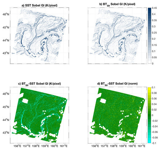 The SST gradients have been computed relying on a 3 × 3 Sobel convolution kernel [36]. The choice of the Sobel kernel will be further justified in Section 4.4 and is suitable for high-accuracy SST/BT data, such as the ones from the Sentinel 3 SLSTR sensor. Figure 3a,b, respectively, depict the SST gradient and the BT (from the S9 channel) gradient intensities, given in K/pixel (≃K/km). Based on our assumptions on the S9 channel, we then compared the gradient of the S9 channel BT (BT) with the one estimated from the SST.