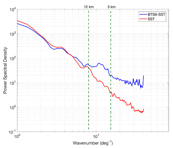Figure 3c depicts the differences between the two gradient fields, evidencing that the BT skill in estimating the SST gradients is a function of the SST gradient itself. The low-gradient zones are well captured by both SST and BT, yielding differences of the order of ±0.05 K/pixel. However, in areas of sharp SST gradients, the BT does not allow for the reconstruction of the full gradient intensity, exhibiting values around 0.1 to 0.2 (in some extreme cases) K/pixel weaker than the SST gradient field. These differences are very likely attributable to the water vapor (WV) effects, tending to smooth the sharpest gradients in the BT field. This is further investigated via fast Fourier transform (FFT) spectral analysis. Focusing on the study area depicted by Figure 2 and Figure 3, we compared the power spectral density (PSD) of the SST and the difference between BT and SST (BT-SST), the latter assumed to represent the atmospheric contribution to the TOA BT. The comparative spectral analysis, depicted in Figure 4, evidences that the SST and BT-SST spectra are superimposed for scales larger than approximately 12 km. Below this threshold, the BT-SST spectrum progressively flattens, assuming characteristics comparable with a field affected by white noise. Although this noisy behavior may result in a smoothing/smearing of the BT largest gradients, for this case the signal associated with the atmospheric contribution exhibits a peak for scales of about 10 km, i.e., larger than the scales characterizing the strongest SST gradient structures (≃1 to 5 km).