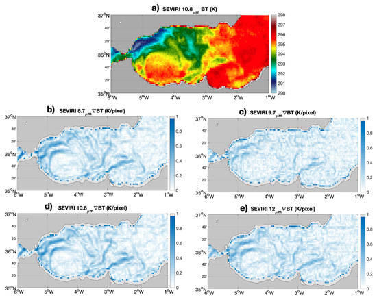 Finally, using (1) we could successfully invert the Planck’s law and obtain the BTs associated with the SEVIRI synthetic PAN channel TARs. Computing the spatial gradients magnitude (see, e.g., Equation (A1)) from the SEVIRI BTs yielded the following scenario: