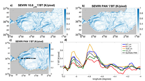 In the end, to support our initial assumptions, we provide a direct comparison of the BT gradients obtained from channel #9 (our reference to assess the sea surface conditions) and the averaged BTs from channels #7–10, i.e., our synthetic PAN-derived estimate.