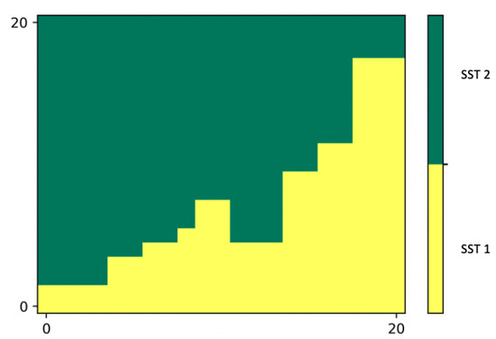 Based on the ARTS forward model described in Appendix A, we carried out a simplified observing system simulation experiment (OSSE) to confirm the preliminary results illustrated in Section 4.1. This experiment served as a preliminary estimation of the Harmony PAN channel capabilities to observe SST gradients. We compared the SST and the BT gradients for an ad hoc SST field, given by an idealized synthetic 21 × 21 pixels scene characterized by two distinct SST areas: SST and SST, with SST = SST + 1K (Figure 8). Such a synthetic scene is compliant with SST fronts found in the real ocean and was used to simulate both inter-tropical and subarctic scenarios, respectively, choosing SST = 299 K and SST =271 K and accounting for typical tropical and subarctic atmospheric compositions [34,37].