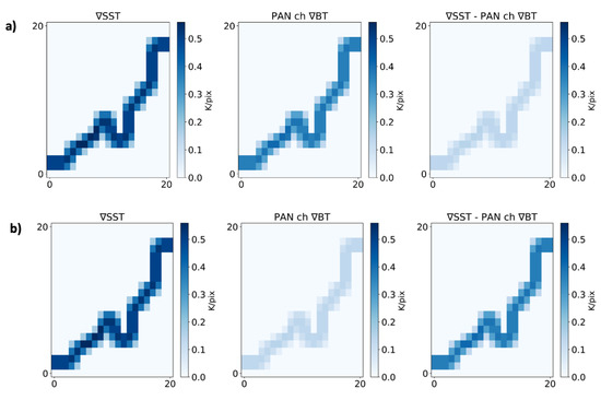 SST- and PAN-BT-derived gradient () comparison for subarctic winter (a) and tropical (b) cases. From left to right: SST gradient, BT gradient and the difference of the two fields.