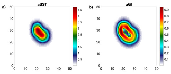 The classical approach to locate satellite SST gradients is to apply derivative kernels to a given SST field. In this section, for the sake of simplicity, we will refer to SST or, more in general, fields organized on a regular grid. Examples of common kernels generally used for these purposes are the Sobel, Prewitt and Roberts, (e.g., [36,38]), as well as the one-dimensional central differences methods. A more detailed description of the gradient computation methods is provided in Appendix B. The key points to take into account when computing gradients are the accuracy in the gradient magnitude estimation, the accuracy in the gradient location and the smoothing of noise effects (see also [17]). We carried out a dedicated study to assess the relative performances of the different methodologies in an idealized context. An analytical function (aSST(x,y)) was used to mimic SST structures at the sea surface, arbitrarily simulating the case of a warm-core eddy-like feature in a 50 × 50 domain. The analytical function that mimics the SST field is expressed by (2):