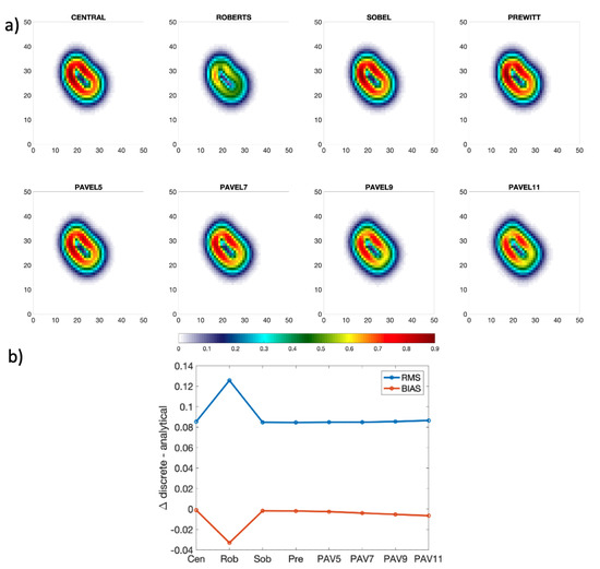 Figure 12. (a) Gradient intensities computed numerically using central, Roberts, Sobel, Prewitt and Pavel5 to 11 schemes. (b) RMSE (blue) and bias (orange) of the numerically computed gradient with respect to the analytical ground truth value calculated from the noise-free temperature field using Equation (3), units are in K. The analyses refer to an aSST field with addition of Gaussian noise with a zero mean and standard deviation of 0.15 K.