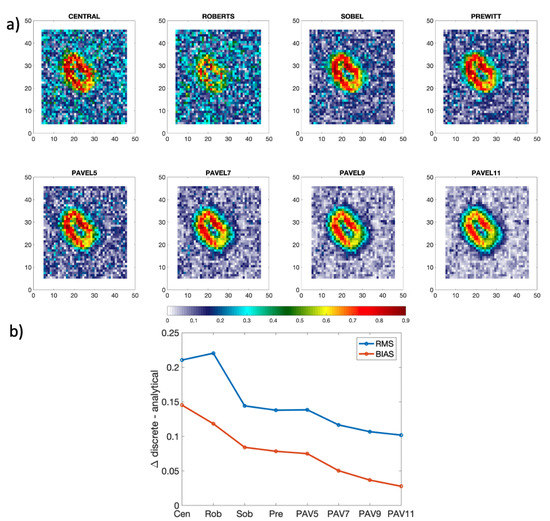 Higher order stencil methods, i.e., accounting for data points located at larger distances from the point of interest, are also available in the scientific literature ([16,17], http://www.holoborodko.com/Pavel/numerical-methods/, accessed on 16 May 2022). These kernels, hereafter referred to as “Pavel” kernels, were used in the present study. As an example, Equations (A4) and (A5) represent the gradient estimate along one dimension: