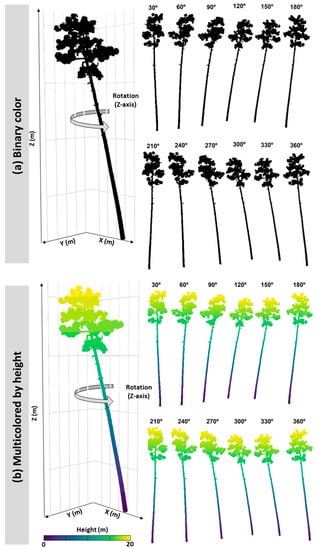 Using the a priori damage severity classification, we derived 12 (1500 × 1500 pixels) 2D images from the 3D point cloud for every single individual tree extracted using the tlsrotate3d function from the rTLsDeep package in R developed in this study [] (see Supplementary Material, Figures S1–S6). Each of the 12 images corresponds to a different viewing angle according to the rotation in the Z-axis at each 30° increment (from 30° to 360°) (Figure 3). We created two sets of 2D images, one using binary colors (black and white) and the other being multicolored by tree height (0–30 m) (Figure 3). In total, we created 1080 2D images per color class (in binary color and multicolored by height) that were then used as inputs in six CNN architectures (Figure 3).