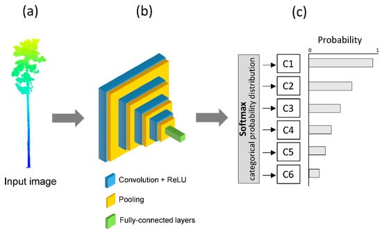 (vi) A simple CNN variant composed of two convolutional layers and one max pooling layer. We have laid out our approach in Figure 4. First, an input image was passed through a set of convolutions, pooling, and fully connected layers for feature extraction (Figure 4b). Then, the softmax classifier was applied to retrieve class membership probabilities, and the input image was classified according to the class that achieved the highest probability score (Figure 4c). The parameters of all networks were initialized with pre-trained values of the ImageNet database [] except the simple CNN variant, which was trained from scratch. During training, to update the network hyperparameters (weights and biases), we used the adaptive moment estimation (ADAM) optimizer [].