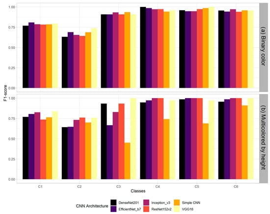 A detailed F1-score by individual classes reveals a higher accuracy for predicting damage severity in classes C3 to C6 compared to the accuracy in classes C1 and C2 (Figure 5). In general, when using images multicolored by height, CNN architectures show better performance based on the F1-score. VGG16 and EfficientNet_b7 had superior F1-score values in all six CNN architectures when using binary color images. For the multicolored-by-height images, VGG16 and Inception_v3 had the highest F1-score in all classes assessed (Figure 5).