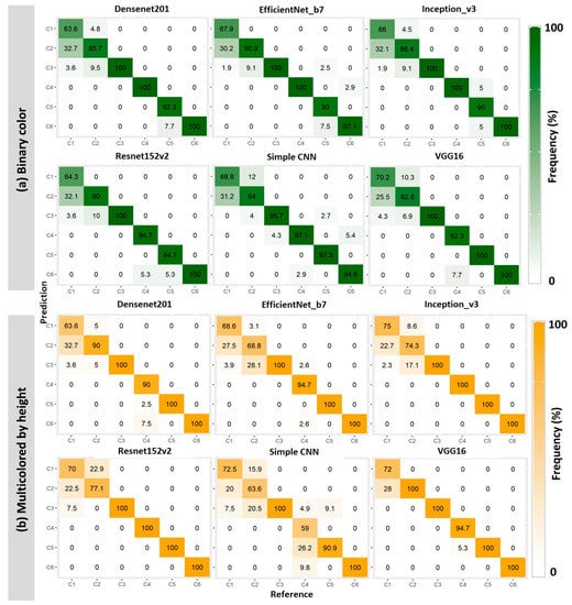 Based on the confusion matrices (Figure 6), both within the binary-color and multicolored-by-height 2D images, we found many samples that were mistakenly classified in classes C1 and C2. Commonly, C1 is misunderstood as C2 and C3. The trees in C2 are also confused with trees in C1 and C3. The confusion matrices show that all models had accurately classified damage severity levels in C3 (95.7% to 100%), C4 (92.3% to 100%), C5 (90% to 100%), and C6 (94.6% to 100%) when using binary-color images and in C3 (100%), C4 (59.0% to 100%), C5 (90.9% to 100%), and C6 (100% correct) when using multicolored-by-height images. For the best overall CNNs, VGG16, Inception_v3, and DenseNet201 were the most frequently accurate. The simple CNN variant, compared with all the other CNN architectures, showed the lowest accuracies on both sets of 2d images.